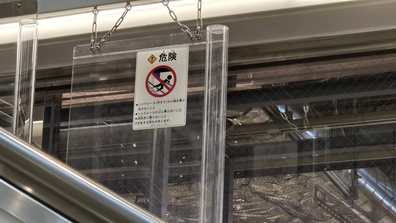 手すり乗り出し禁止V2はエスカレーターのボディだけでなく、アクリル製保護板にも貼付されています。