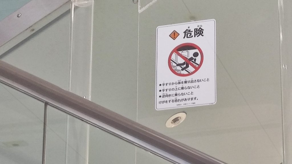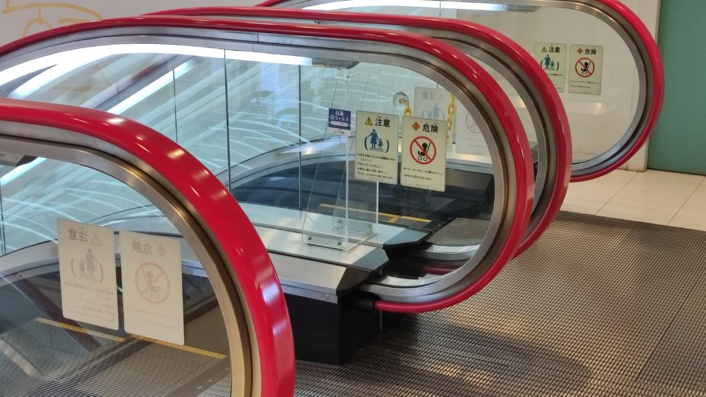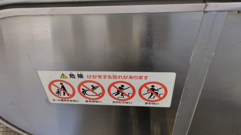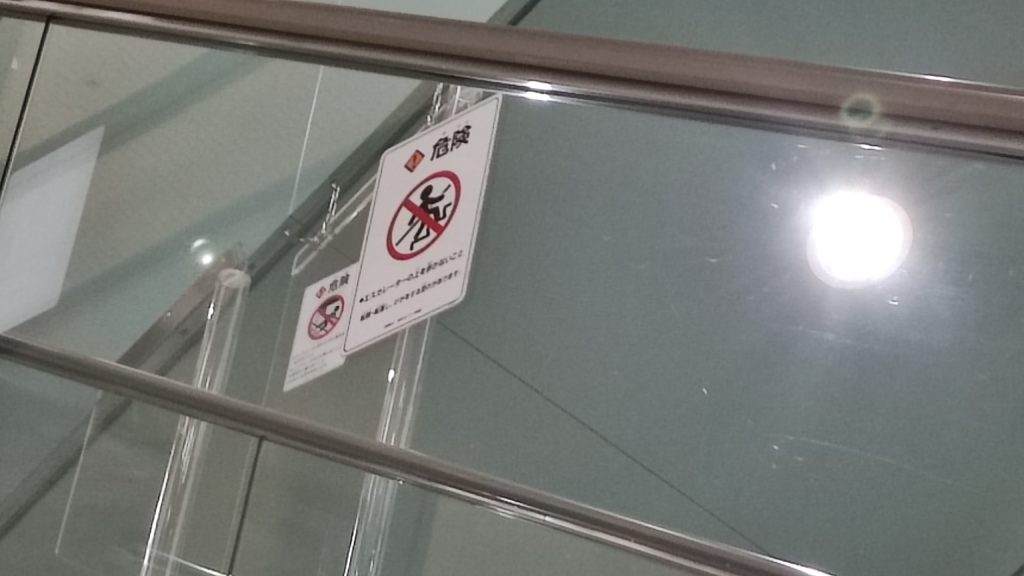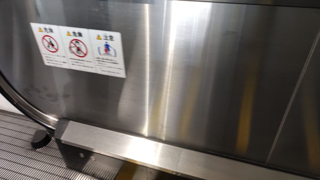 2枚目の写真にある歩行禁止ステッカーはエスカレーターの途中に貼られているのですが、幸いにも1階のエスカレーターの下に空間があるのでそこから撮影できました。
