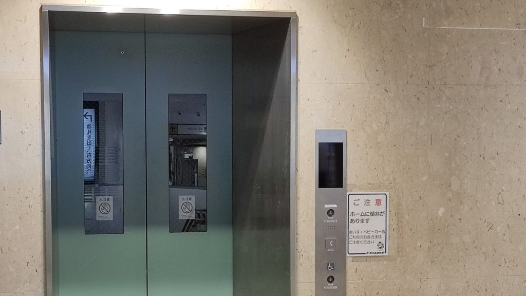 エレベーターは泉ヶ丘駅でもこの後のジョイパークでも同じ、手のひらのステッカーです。泣き顔のイラスト以上に見かける頻度が高いでしょう。