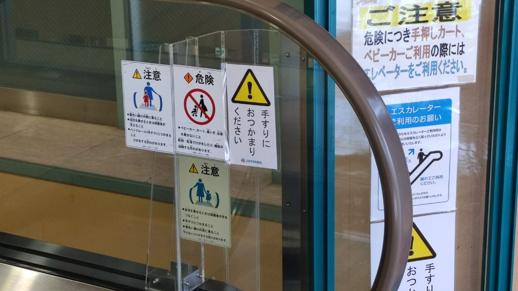 まずは1階と2階の吹き抜け部分。エスカレーターのボディには4種横長のみが貼られていますが、遊ぶこと禁止ステッカーはボディではなく上部にあるアクリル板にあります。