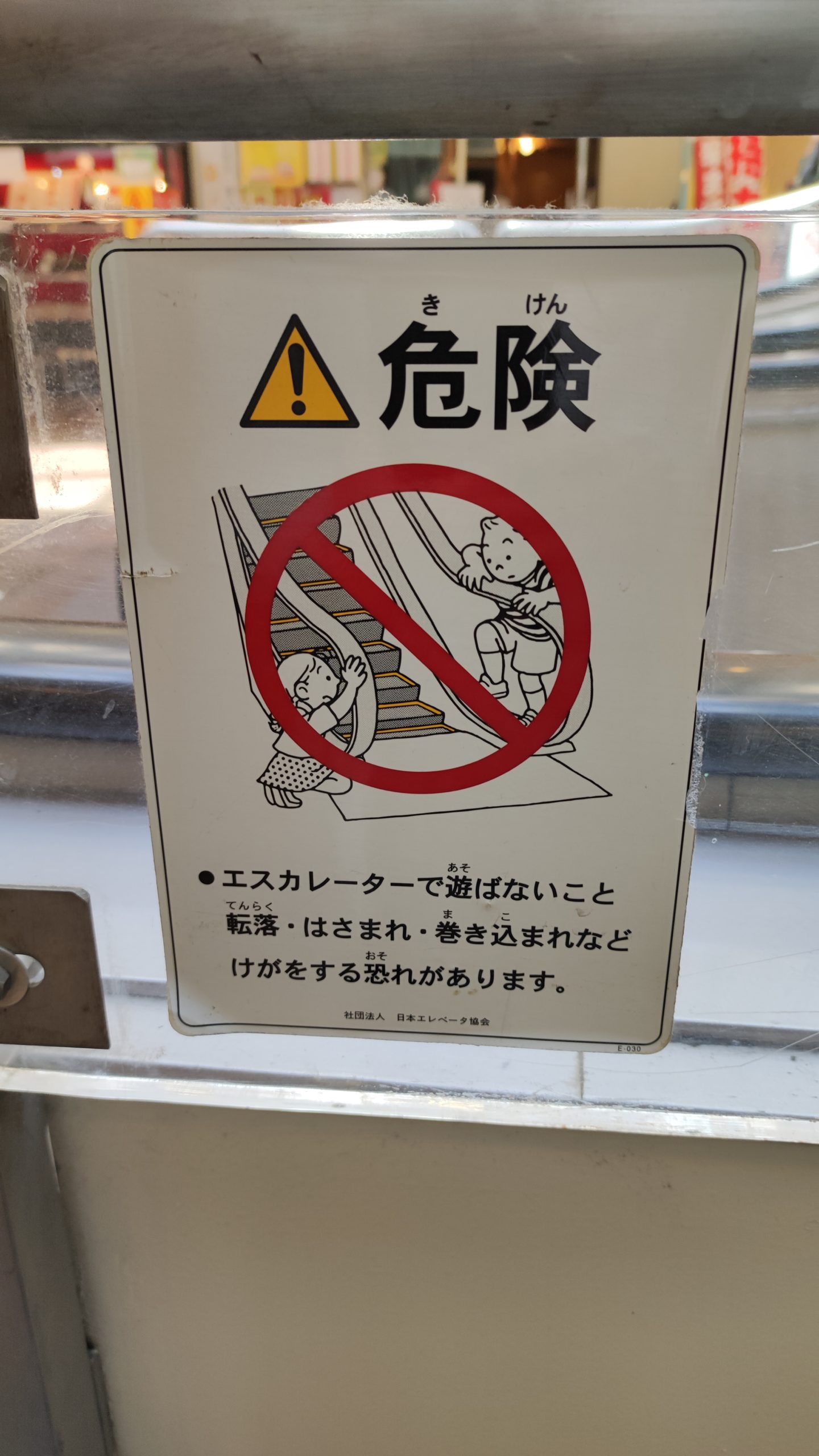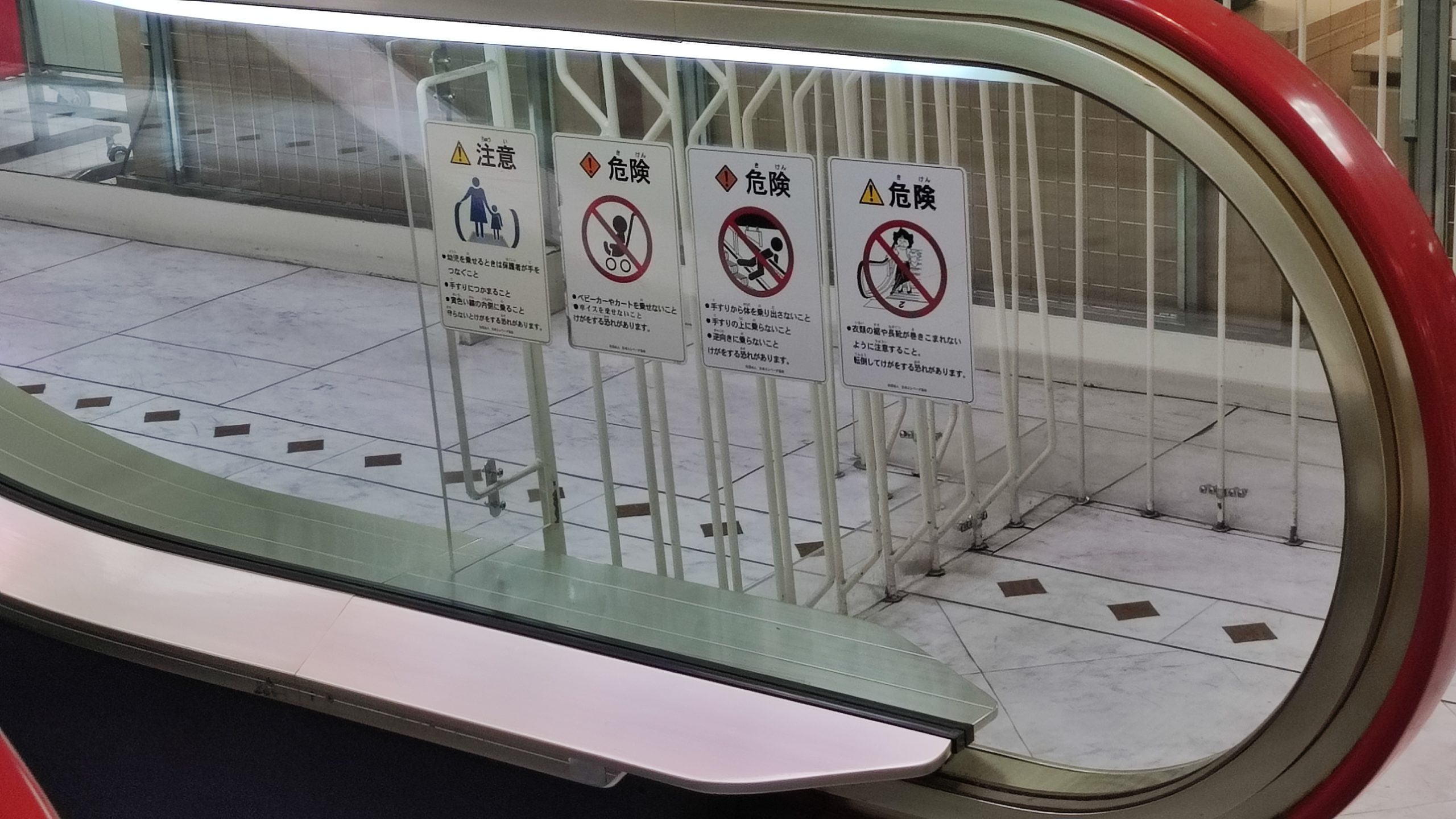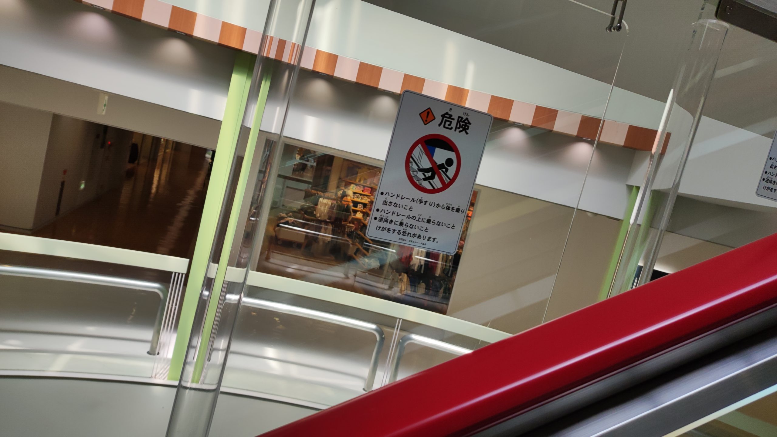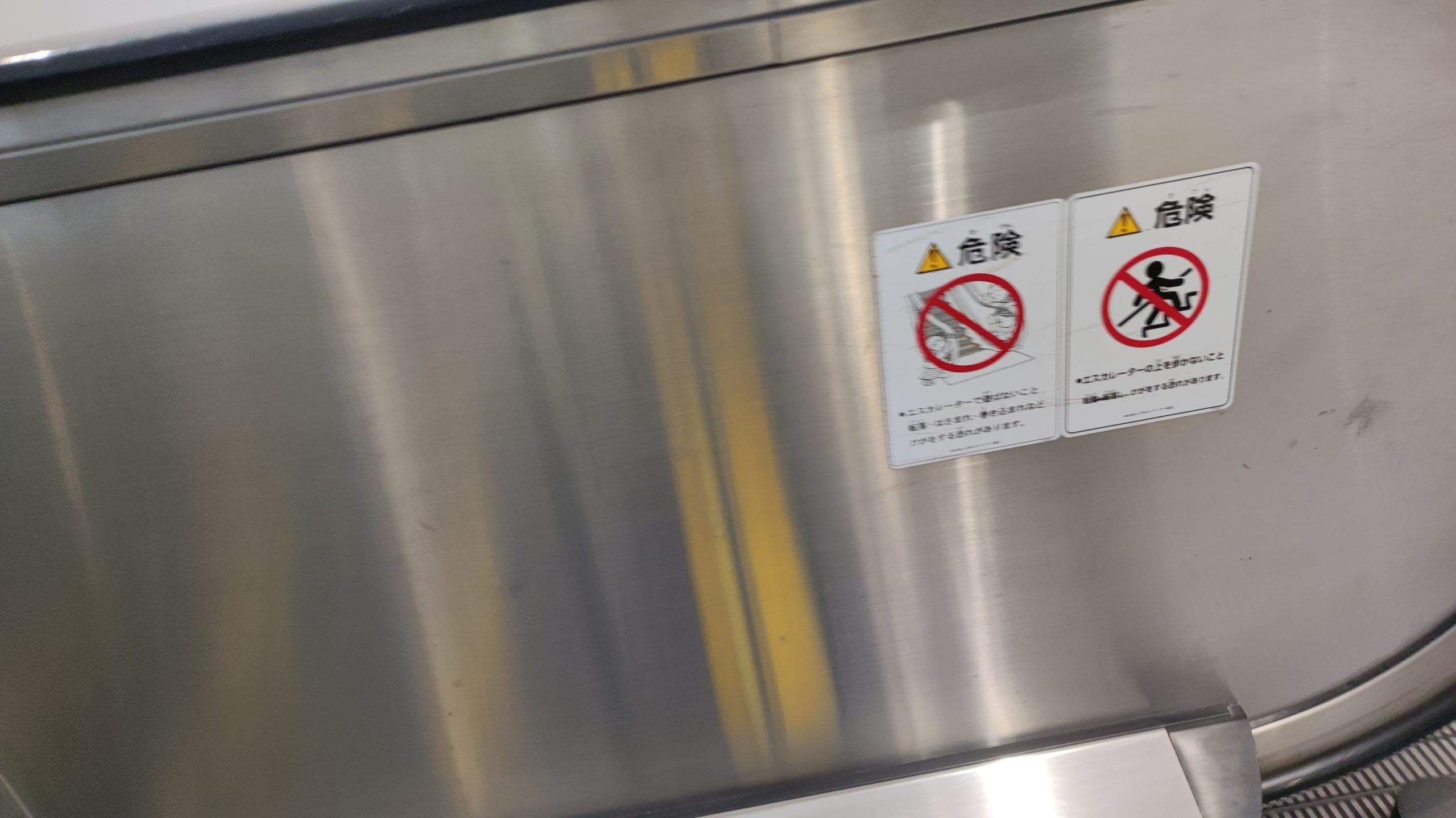 2枚目の写真にある歩行禁止ステッカーはエスカレーターの途中に貼られているのですが、幸いにも1階のエスカレーターの下に空間があるのでそこから撮影できました。