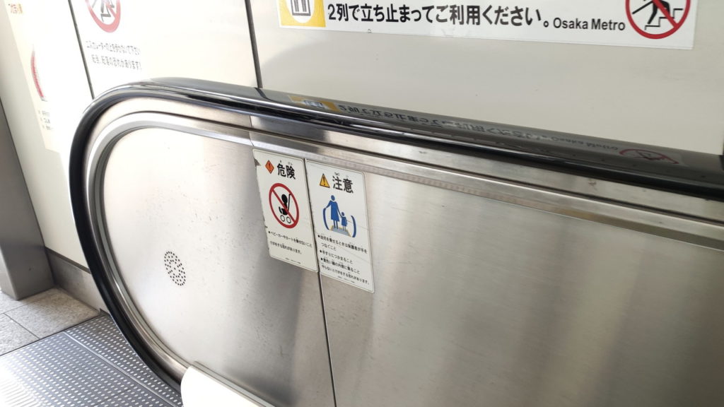 大阪メトロ独自制作と思われる細長のステッカー「エスカレーターでは2列で立ち止まってご利用ください」、エレ協の歩行禁止ステッカーよりも大きなサイズで掲示された「歩行禁止のビッグサイズ版ステッカー」もお約束。
