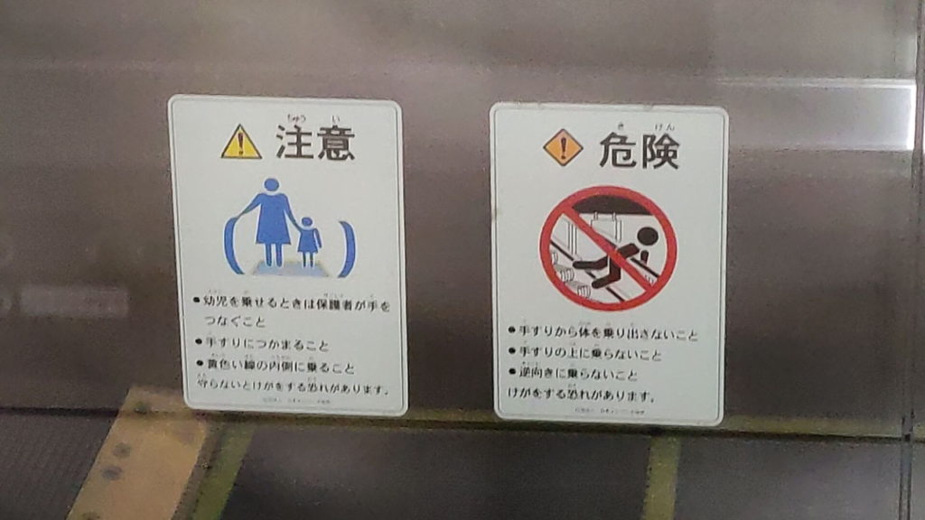 乗っている途中には「歩行禁止」の1枚。この貼られ方は大阪メトロの駅のエスカレーターでよく見かけます。