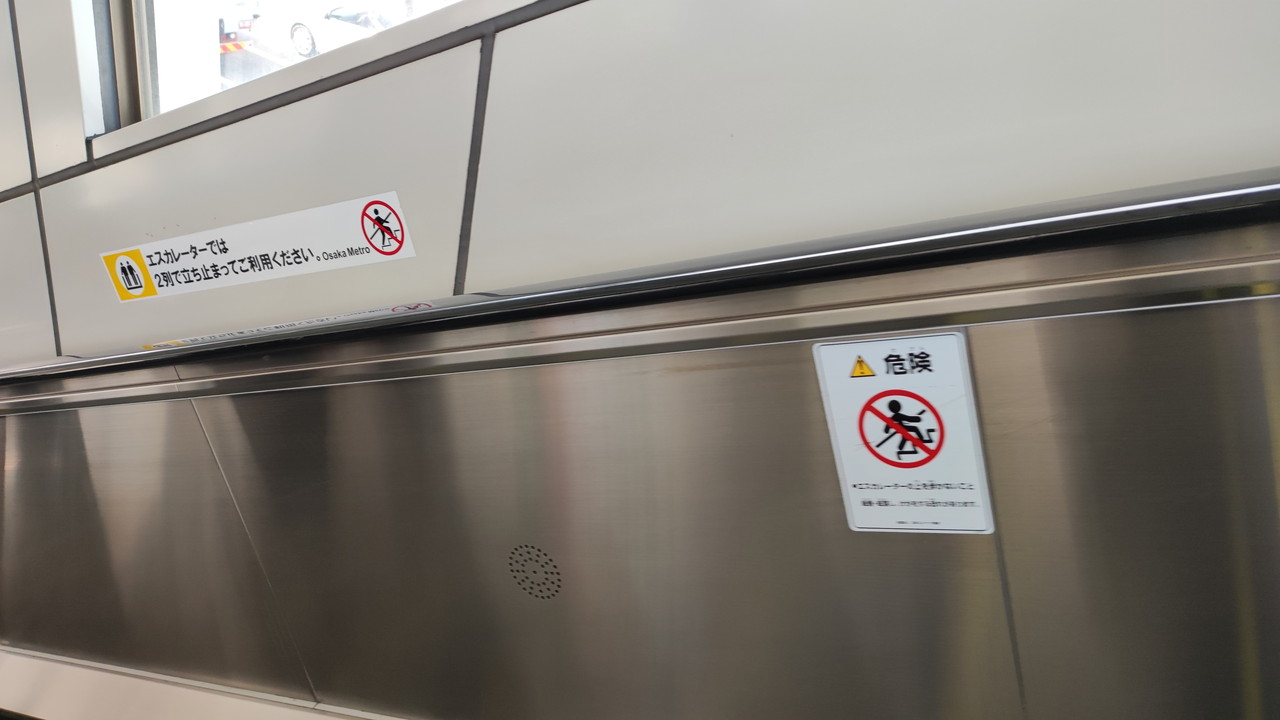 大阪メトロ独自制作と思われる細長のステッカー「エスカレーターでは2列で立ち止まってご利用ください」、エレ協の歩行禁止ステッカーよりも大きなサイズで掲示された「歩行禁止のビッグサイズ版ステッカー」もお約束。