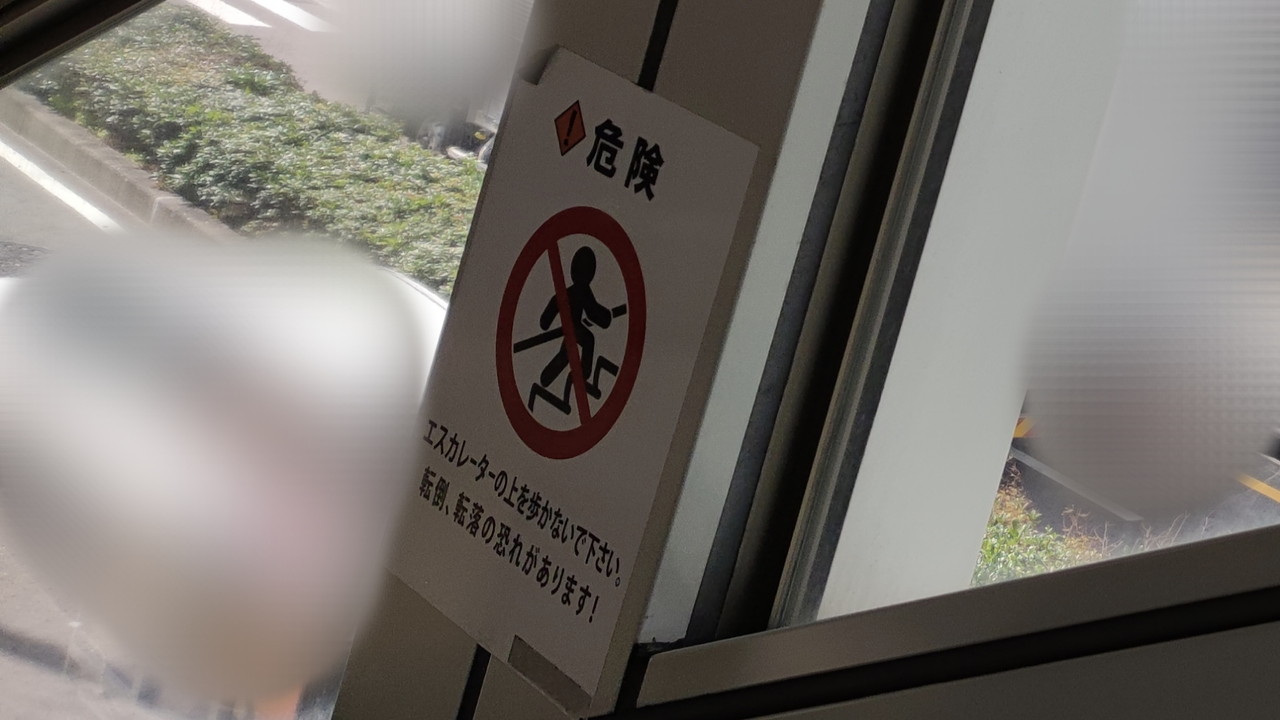 乗っている途中には「歩行禁止」の1枚。この貼られ方は大阪メトロの駅のエスカレーターでよく見かけます。