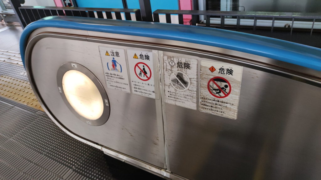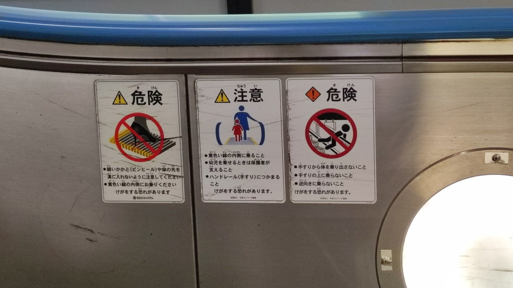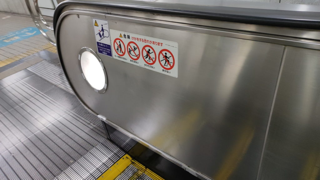 他の場所でもエスカレーター本体ではなく壁に貼られているケースを見かけますが、独自制作と思しき大きなステッカーと対比すると小さくみえますね。こういう貼られ方はなかなか見かけないので撮った写真を見返したくなります。