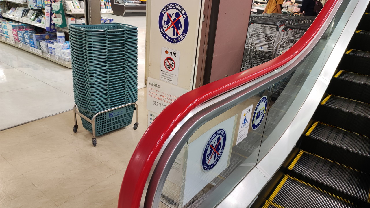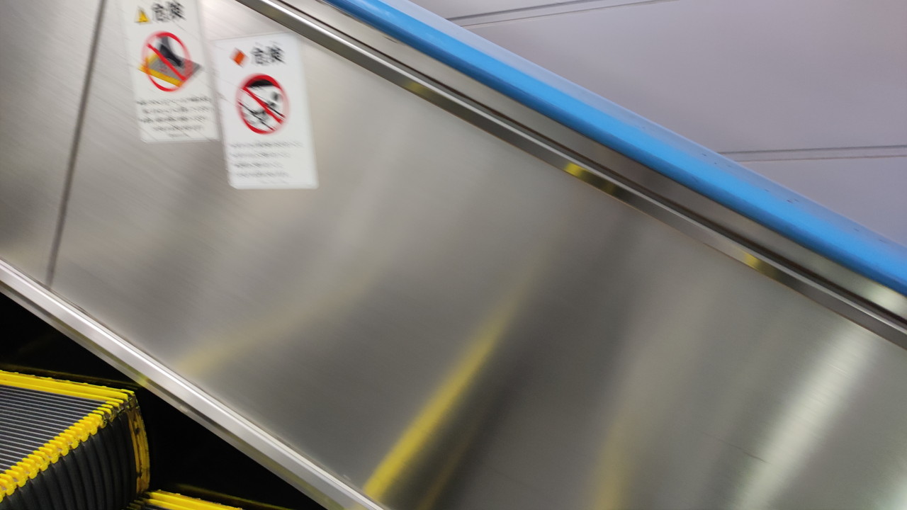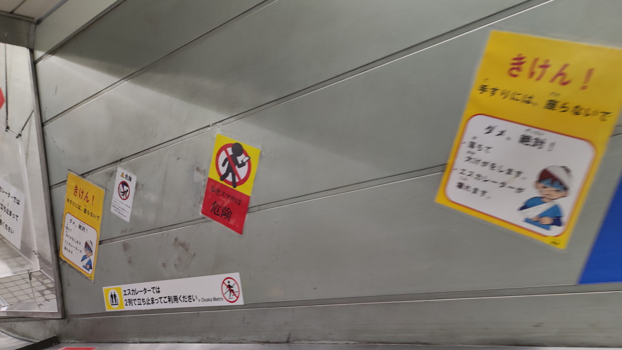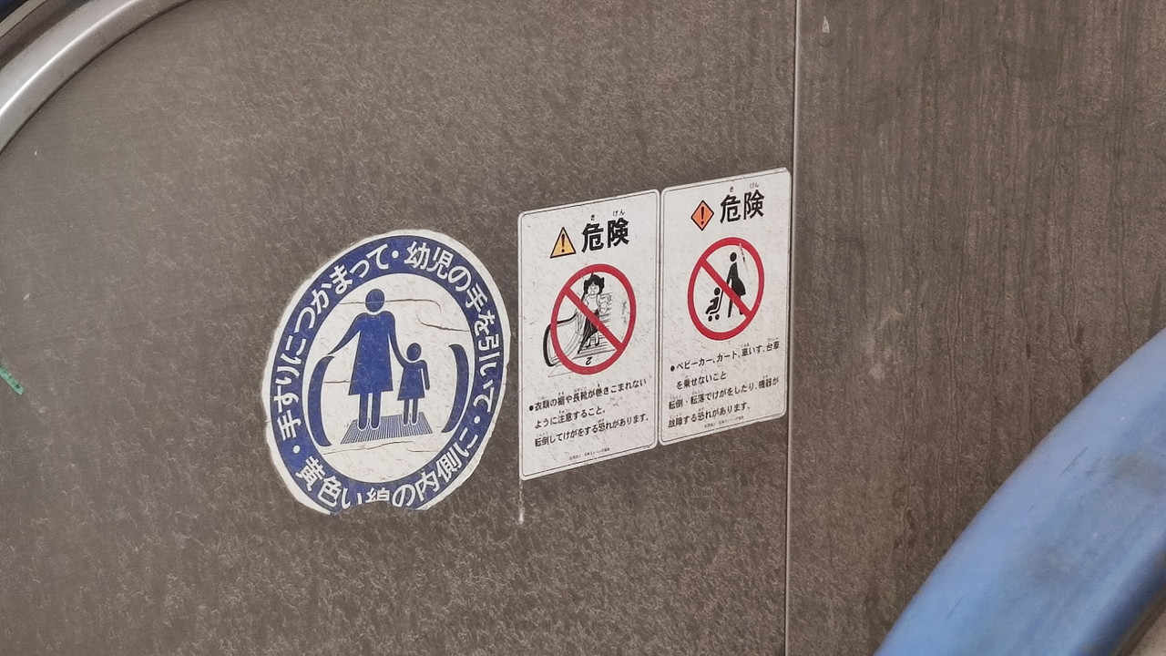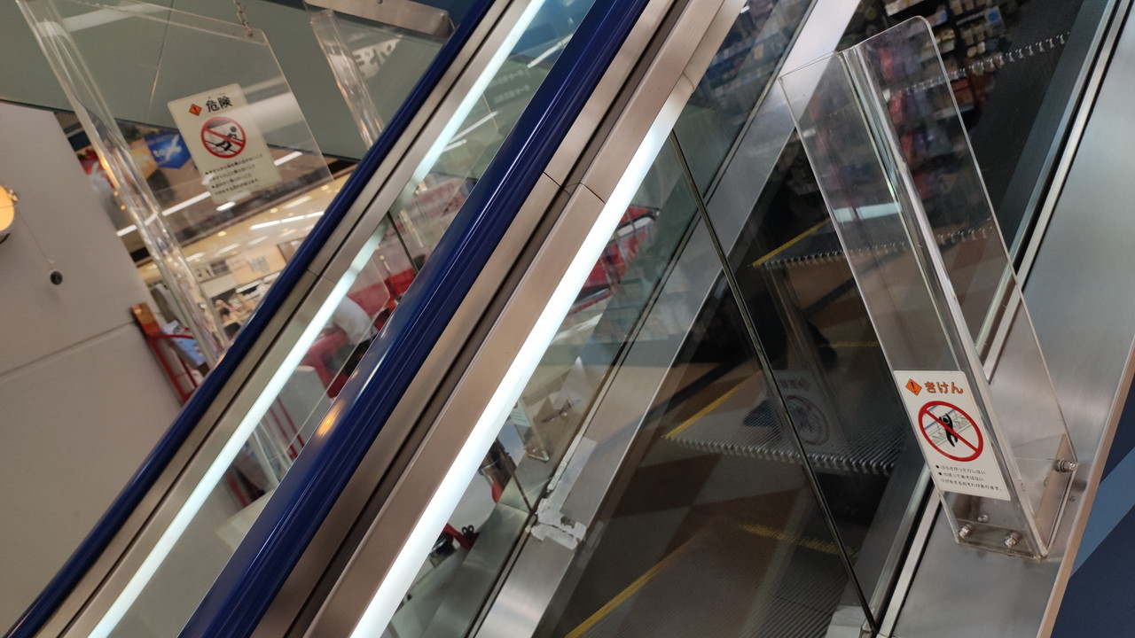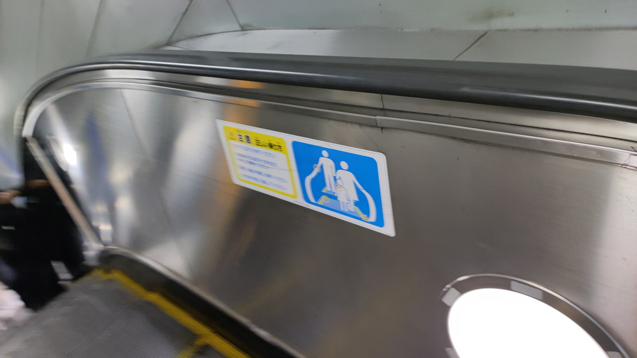 他の場所でもエスカレーター本体ではなく壁に貼られているケースを見かけますが、独自制作と思しき大きなステッカーと対比すると小さくみえますね。こういう貼られ方はなかなか見かけないので撮った写真を見返したくなります。