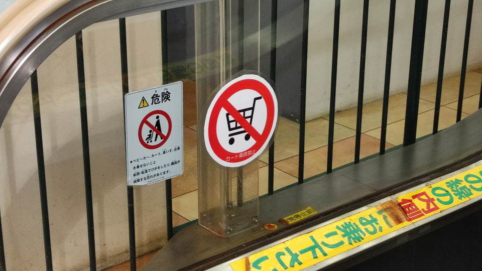 エスカレーターのステッカーは3枚で、すべてカート類禁止に関する内容。