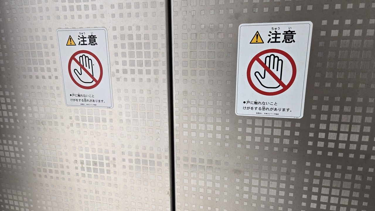 発見した公式ステッカーはエレベーターで、手のひらのイラストの上に赤い禁止マークが被さった「接触禁止」ステッカー。外ドアに2枚と、内ドアにも貼られています。