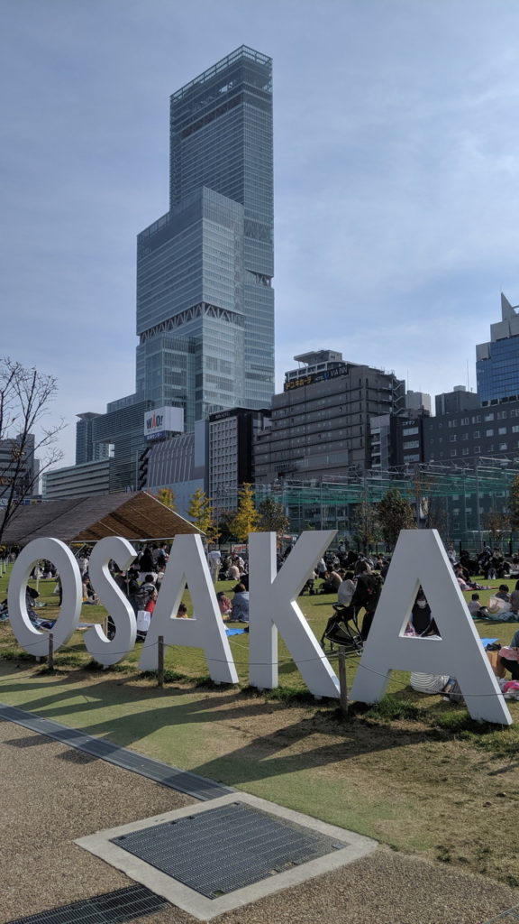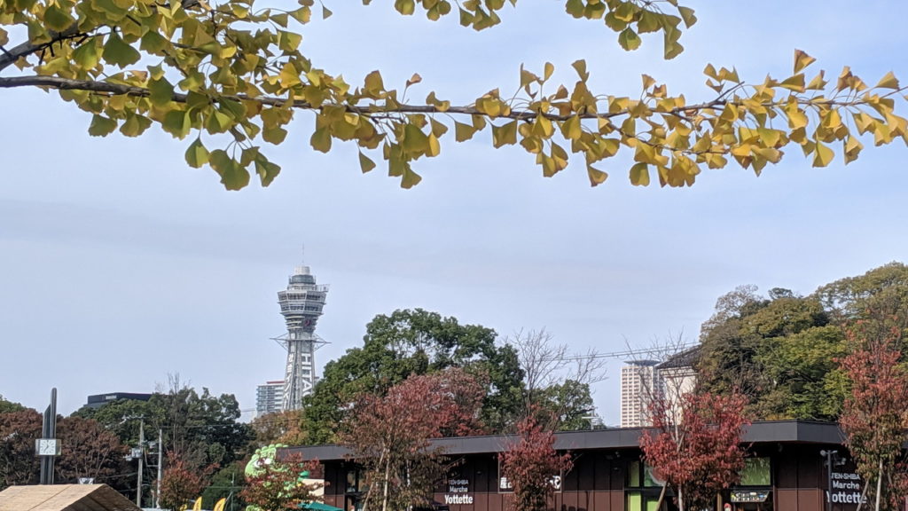 そして通天閣が見えます。所在地の区は違いますが(てんしばは天王寺区、通天閣は浪速区)、地理的にはそれほど遠く離れていません。