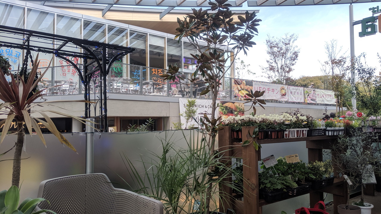「ガーデナーズてんしばi:na」に併設のカフェで昼食です。店内の席は満席だったのでテラス席ですが、花や木々など(商品)を眺めながら食事できます。 ちなみに今日は近くで手作りピザ体験の参加客の姿もあり、ピザを焼くときの炭火の香りが食欲をそそりました。