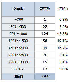 文字数ごとで集計すると最も多く占めているのが「501文字~1,000文字」の記事。