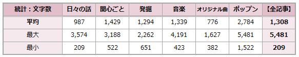 全記事の平均文字数が1,300文字程度。ポップンのカテゴリーに属する記事以外は平均文字数が1,500文字以下という結果に。