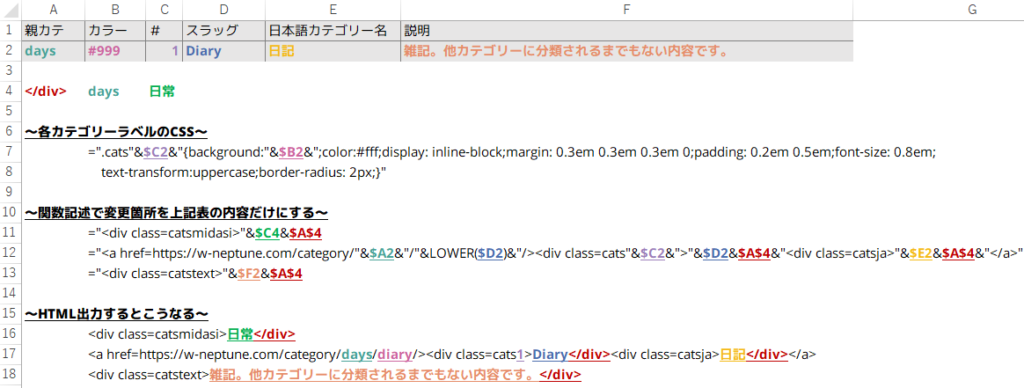 各カテゴリー毎に色を変えてスタイルシートに記述しているので、少し手間を省くため、Excelでカテゴリーの名前や通番、説明、テーマカラーをまとめた表を作り、使い回すHTML記述やCSSの内容と併せて関数で合体させています。
