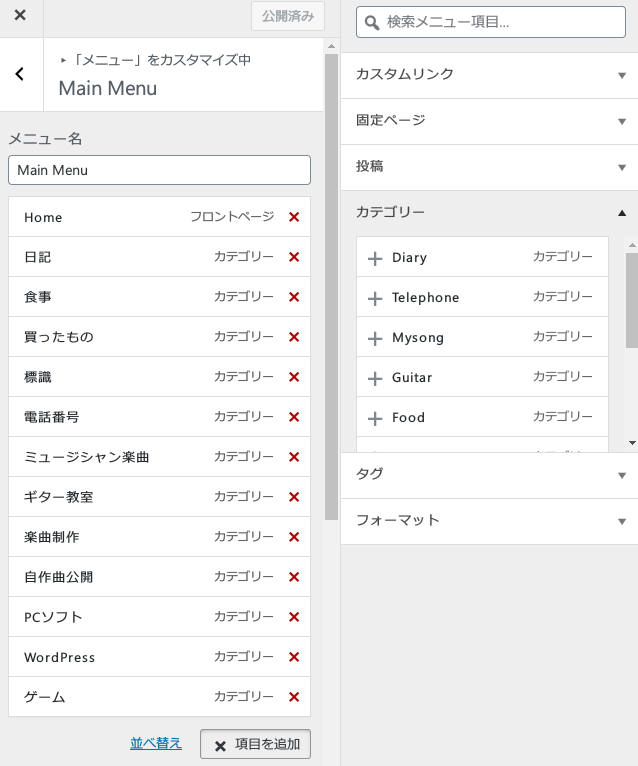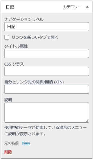 今回はメニューバーにカテゴリーアーカイブページへのリンクを追加しました。表示される名前は変更可能で、このブログの場合は各カテゴリーの日本語名にしました。(ex. 「Diary」→「日記」)