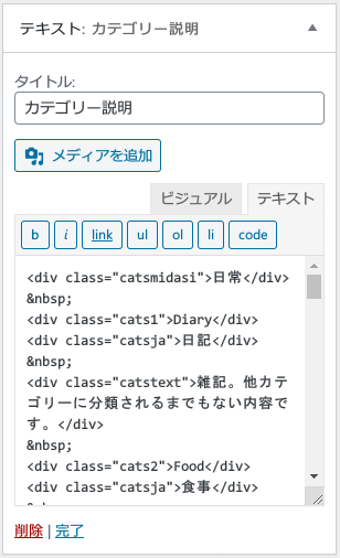 カテゴリー名は現在、英単語の名前にしていますが、日本語を併記すべく、テキストウィジェットを作成し、そこに各カテゴリーページへのリンクと、分類している記事についての説明文を記載しました。